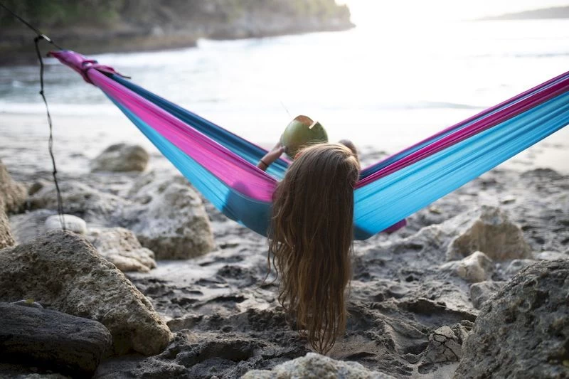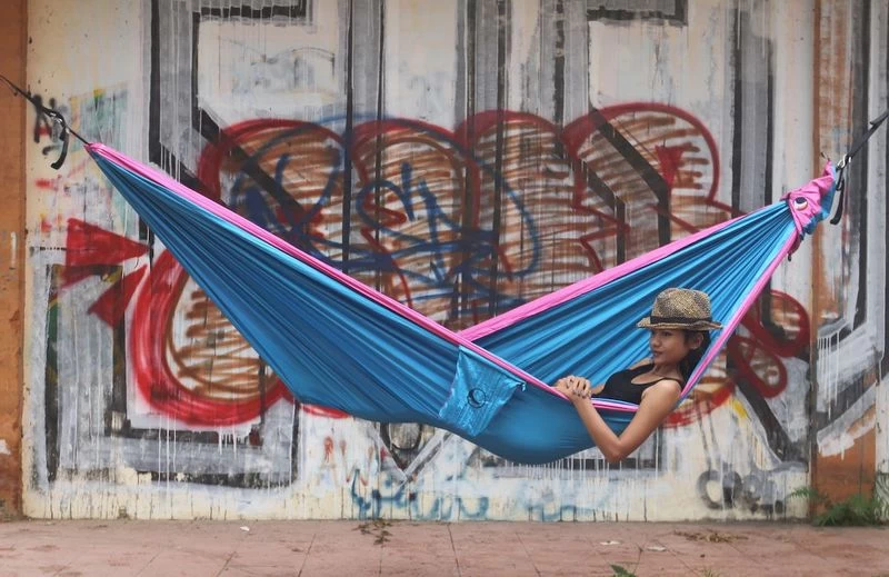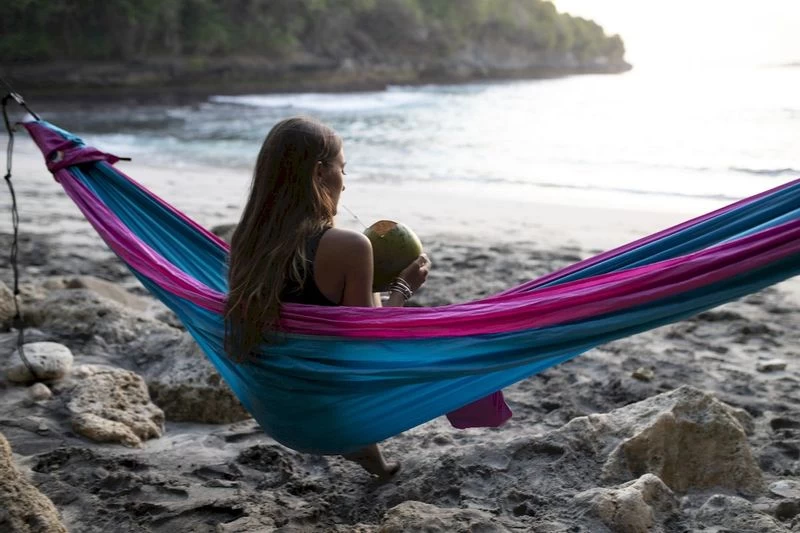 De reishangmat is dus gemaakt van parachutestof. Lichtgewicht en een compact formaat zijn maar een van de vele voordelen. De 2 persoons hangmat is door de stof ademend en licht elastisch, waardoor de hangmat zich perfect naar jouw lichaam vormt. Niet alleen maakt dit het slapen een stuk comfortabeler, maar het heeft ook nog een positieve invloed op jouw bloedsomloop. Het materiaal zorgt er ook voor dat de hangmat rot bestendig, sterk en sneldrogend is. Geen stress dus dat jouw hangmat de rest van je spullen nat maakt in je backpack.